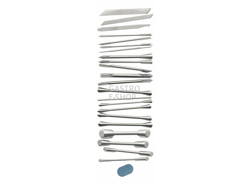 Sada 22 ručních řezných dekoračních nástrojů v celonerezovém provedení s taškou a brouskem.