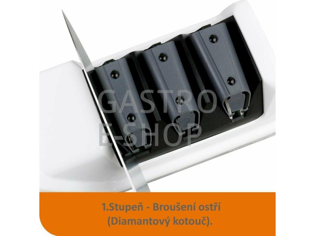 Během broušení je čepel nože vedena pomocí plastového pouzdra v předepsaném sklonu, brusné kotouče reagují pomocí pružin na rozdílnou tloušťku každého nože.