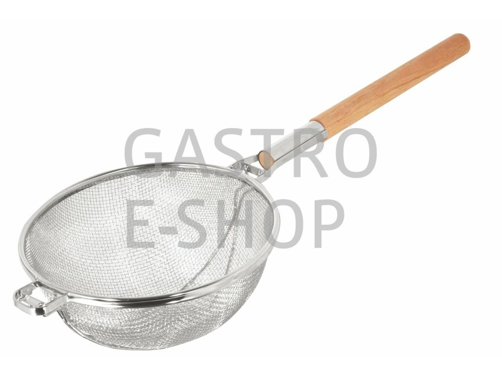 Profesionalní cedník s dvojitým nerezovým sítem (hrubé+jemné) úchytem a dřevěnou rukojetí pro snadnou manipulaci při práci.