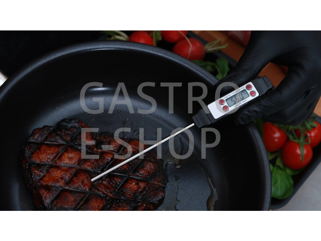 Přenosný teploměr s digitálním ukazatelem naměřených hodnot s teplotní vpichovou sondou. Hrot kovového čidla teplotní sondy se hodí pro měření v tekutých i pevných látkách. Teploměr je napájen 1,5 V článkem.