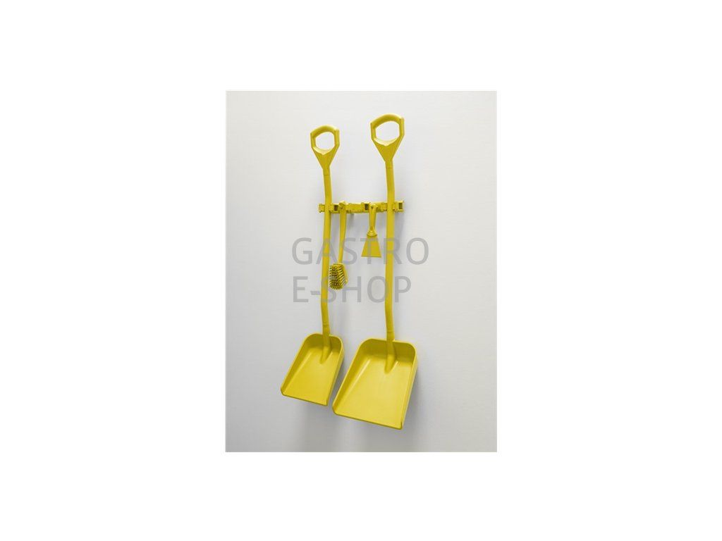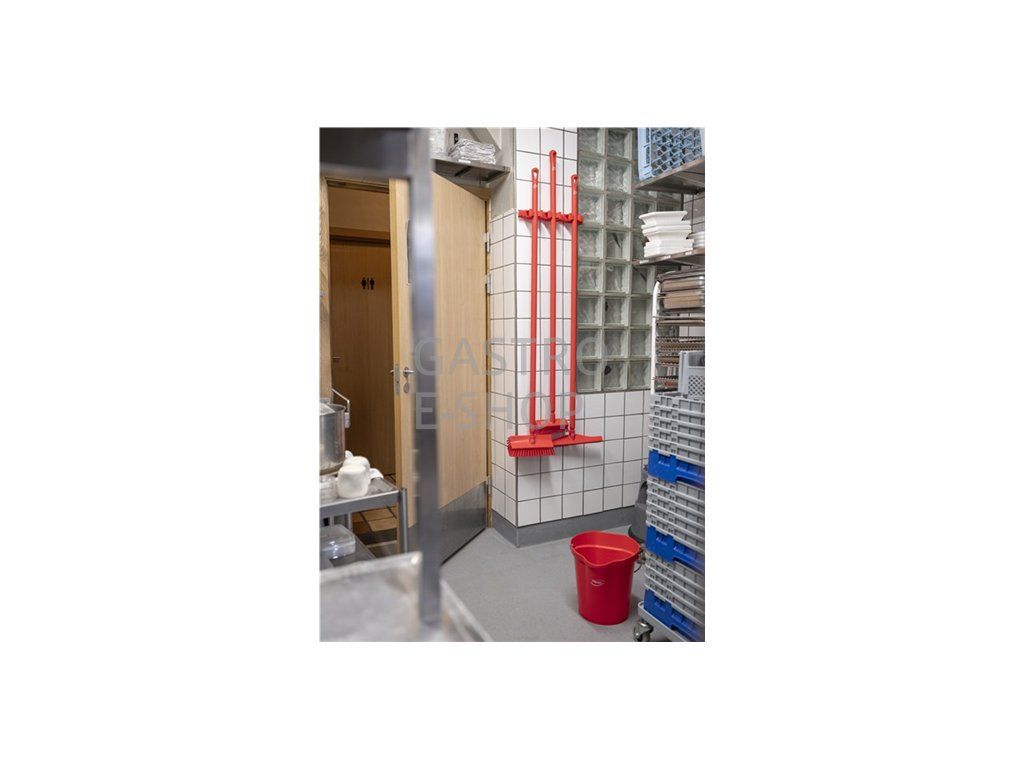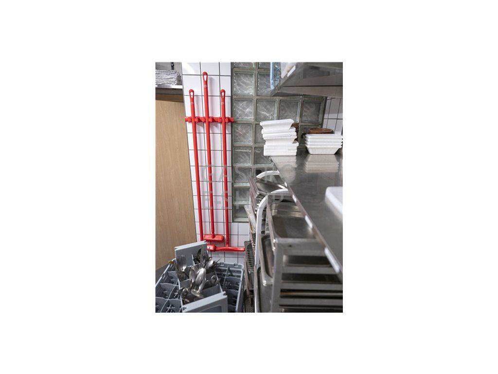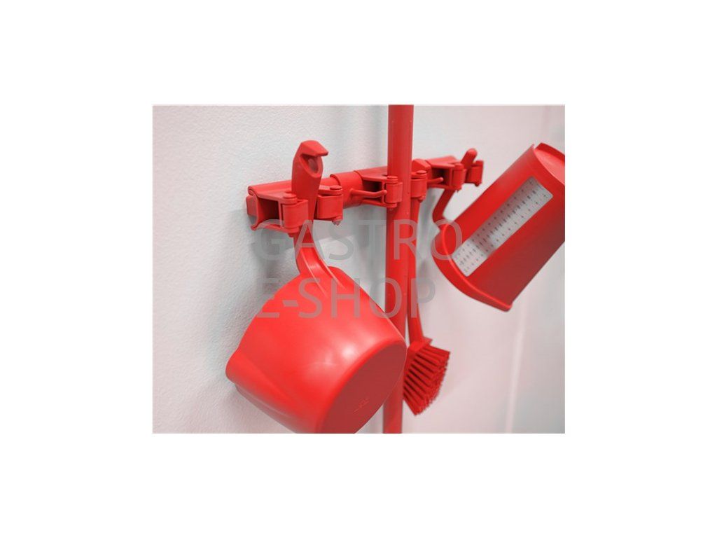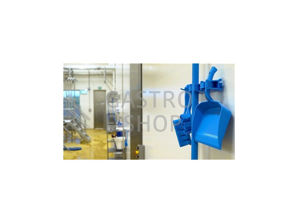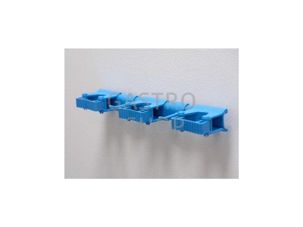 Modrá varianta modulárního nástěnného držáku pro uložení hygienického nářadí a pomůcek na pracovišti. Barevné varianty jsou určeny k použití v rámci barevného kódování. Lištu lze snadno připevnit na 4 nástěnné držáky nasunutím z pravé nebo levé strany. K dispozici jsou dva druhy úchytů – jeden pro zavěšení (háček) a jeden pro pevné uchycení. Na lištu lze umístit 1-10 úchytů (Max. 10 háčků na zavěšení nebo max. 5 na pevné uchycení). Úchyt pro pevné uchycení pojme produkty o průměru 28–33 mm. Háček udrží produkty o hmotnosti až 3 kg. Systém se dodává se 3 úchyty pro pevné uchycení a 2 háčky. Produkt lze snadno rozebrat za účelem čištění nebo výměny.