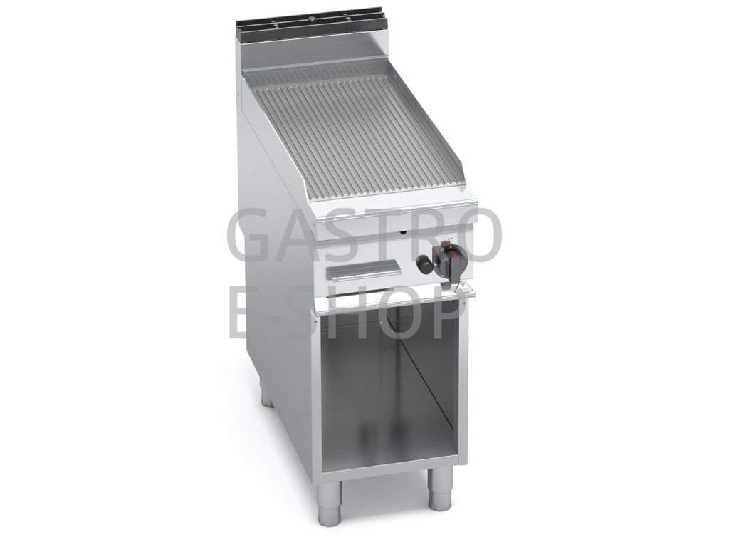 Termostatický ventil 30 až 300°C pro přesnou a bezpečnou regulaci. Termočlánek a chráněný zápalný plamínek. Deska je rýhovaná jež usnadňuje čistění, zvýšené postranní lemy. Kompaktní provedení s otevřeným podstavcem. Kompletní sortiment plynových a elektrických ploten s různým provedením grilovací plochy. Lze na nich připravovat pokrmy tzv. "kontaktem" a to nejcitlivějším způsobem. Jednotný systém distribuce tepla zaručuje rovnoměrné grilování po celé pracovní ploše, velké energetické úspory a zlepšení pracovního prostředí. Při grilování se přirozeně tvoří zbytkový olej, který je odváděna shromažďován ve velké odpadní nádobce.