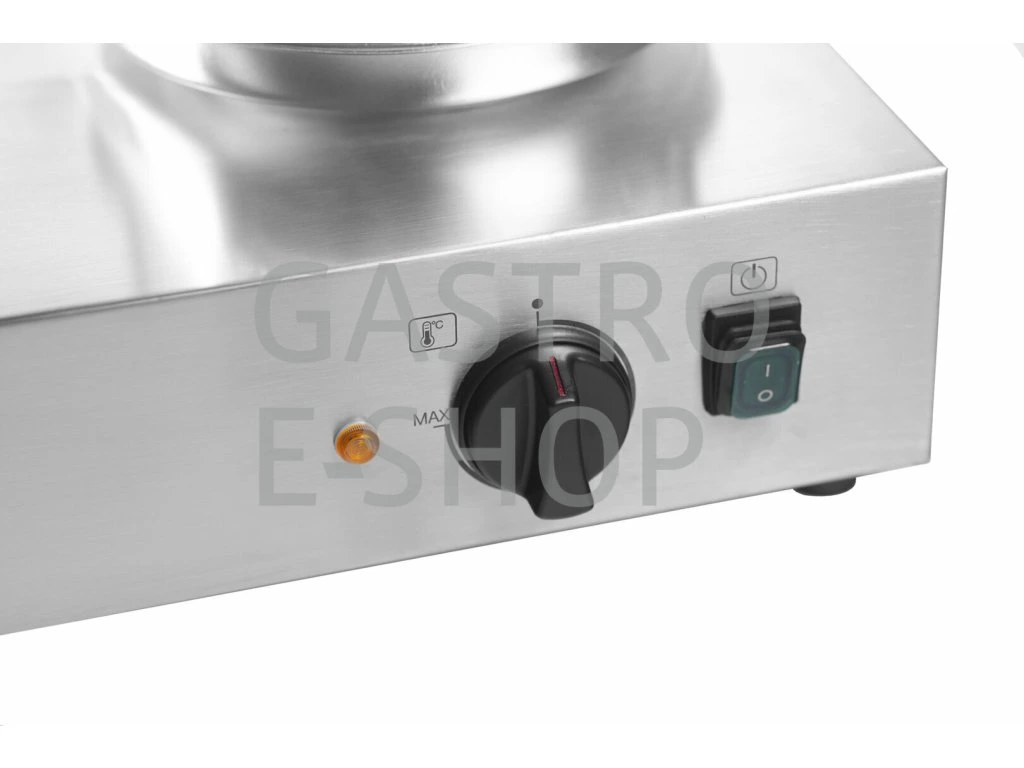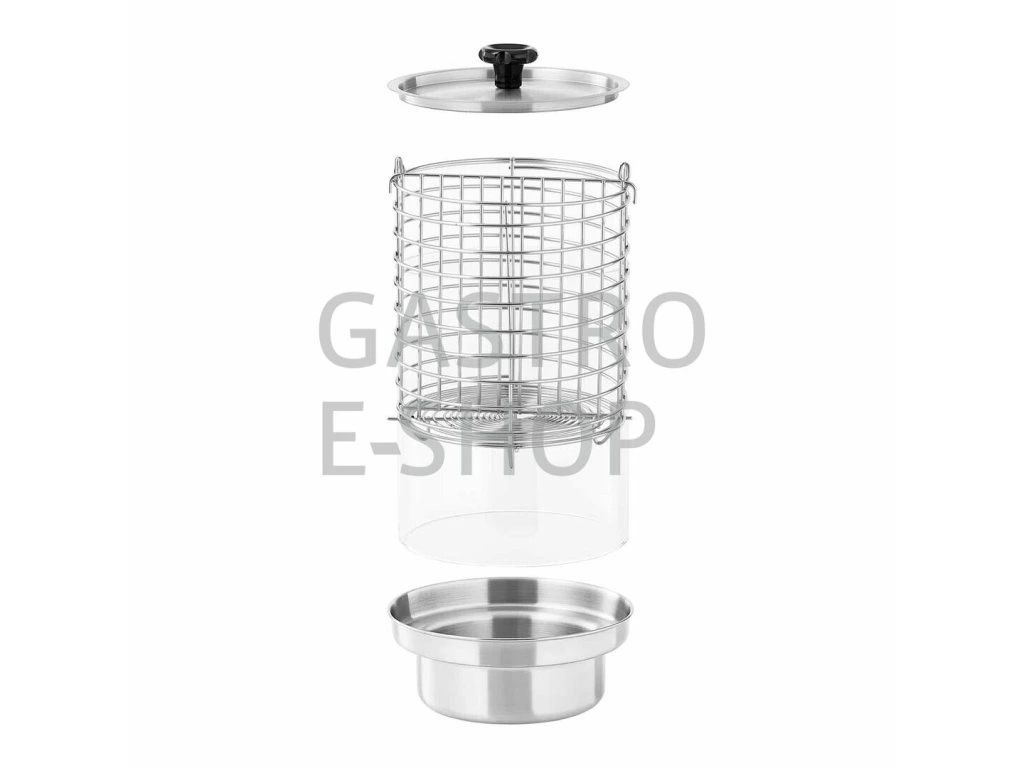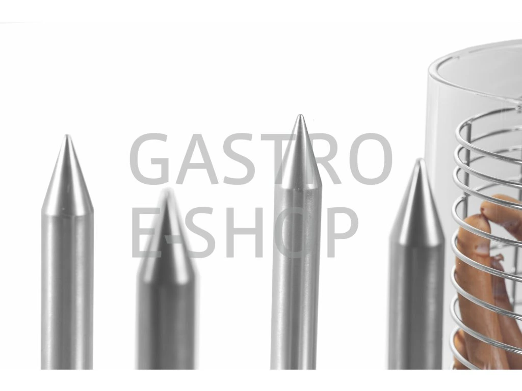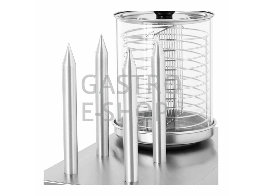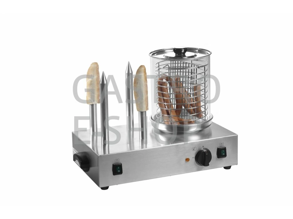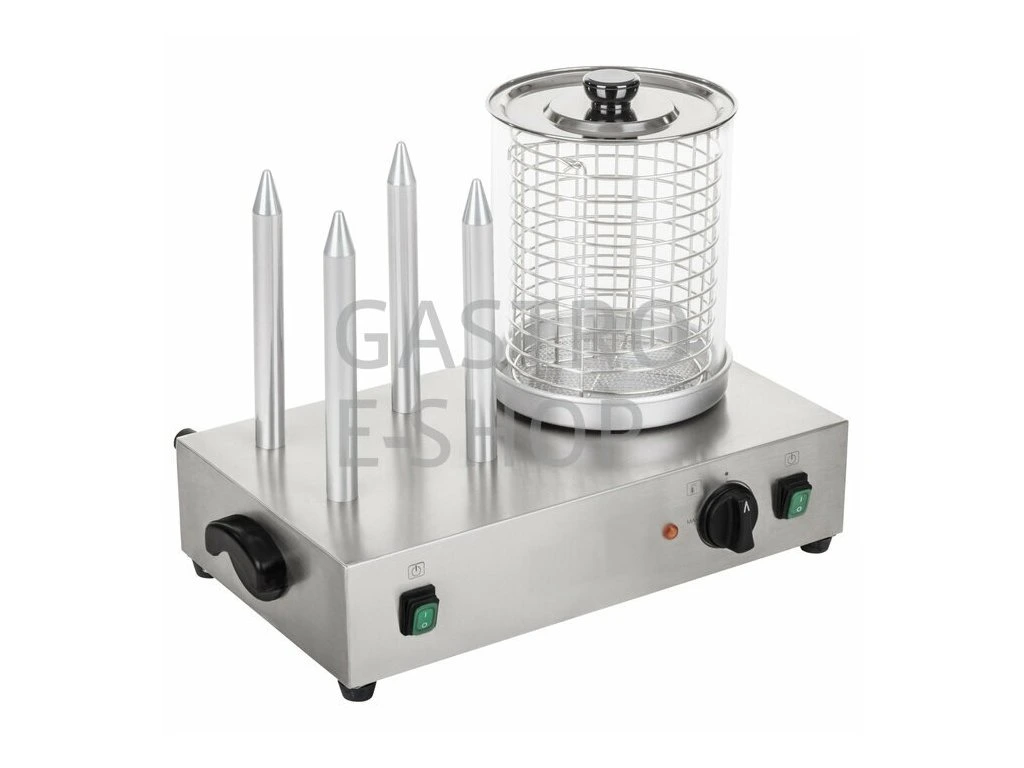 Elektrické zařízení Hot Dog HHD-1 je skvělým pomocníkem v každém stánku, občerstvení, kiosku či kuchyni. Hot dog je v nerezovém provedení, 4 vyhřívané trny, velký skleněný válec s vyjímatelným nerezovým košem a dělící přepážkou (možnost ohřívat různé druhy párků a klobás). Regulační termostat pro nastavení požadované teploty ohřevu párků (šetrný ohřev v páře 30-95°C), ve skleněné nádobě a vloženém koši můžete ohřívat až 30 párků (ohřev v páře je velmi šetrná metoda, párky si díky ní zachovají svou strukturu a tvar a nepopraskají), hot dog je dále vybaven samostatně vyhřívanými 4 trny ohřevu párků (výhřevné trny s topným tělesem umožňujícím nahřátí do 70°C pro ohřev rohlíků). Zařízení je vybaveno plastovými madly pro bezpečnou manipulaci, kontrolkou chodu, termostatem a vypínačem.