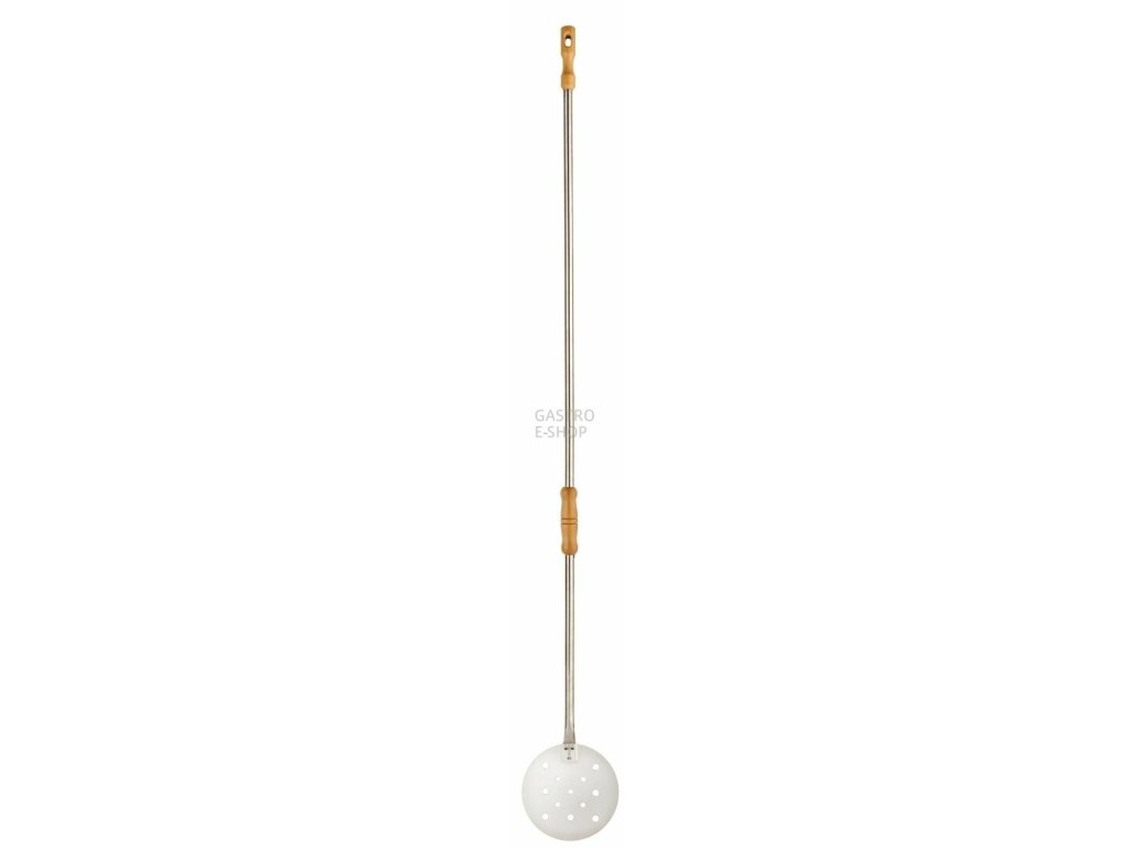 Lopata na pizzu s dlouhou nerezovou násadou a dřevěnou rukojetí.