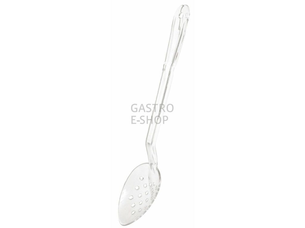 Servírovací perforovaná polykarbonátová lžíce v čirém provedení o délce 30 cm.