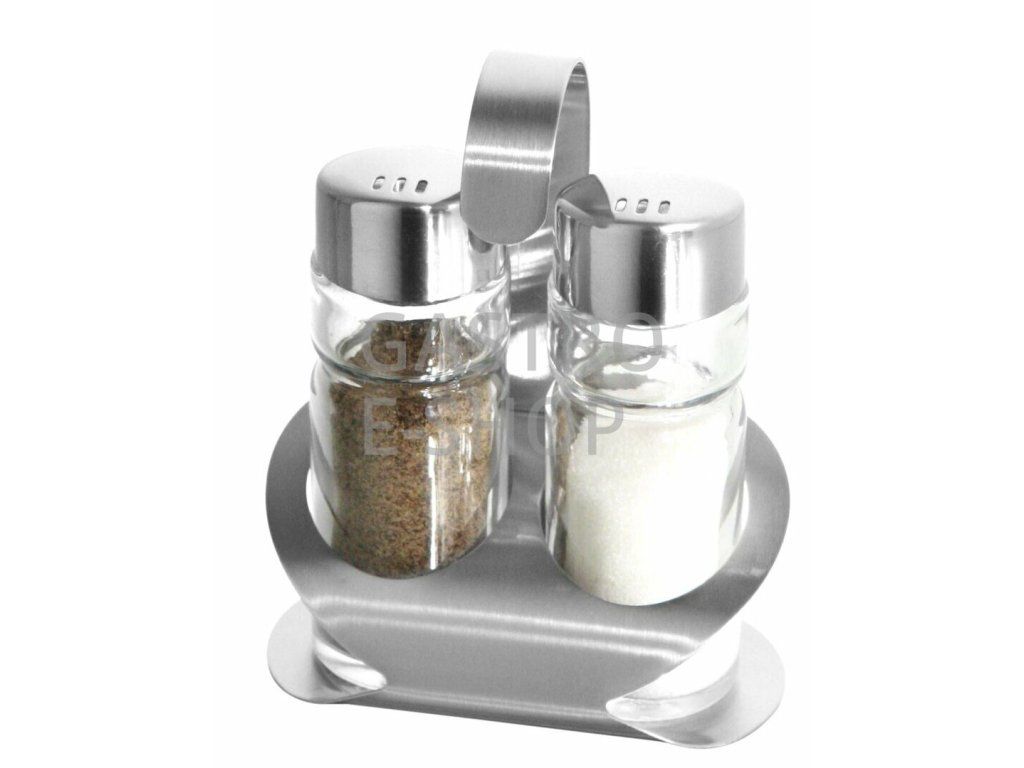 Elegantní nerezové stolní provedení menážky se slánkou a pepřenkou.