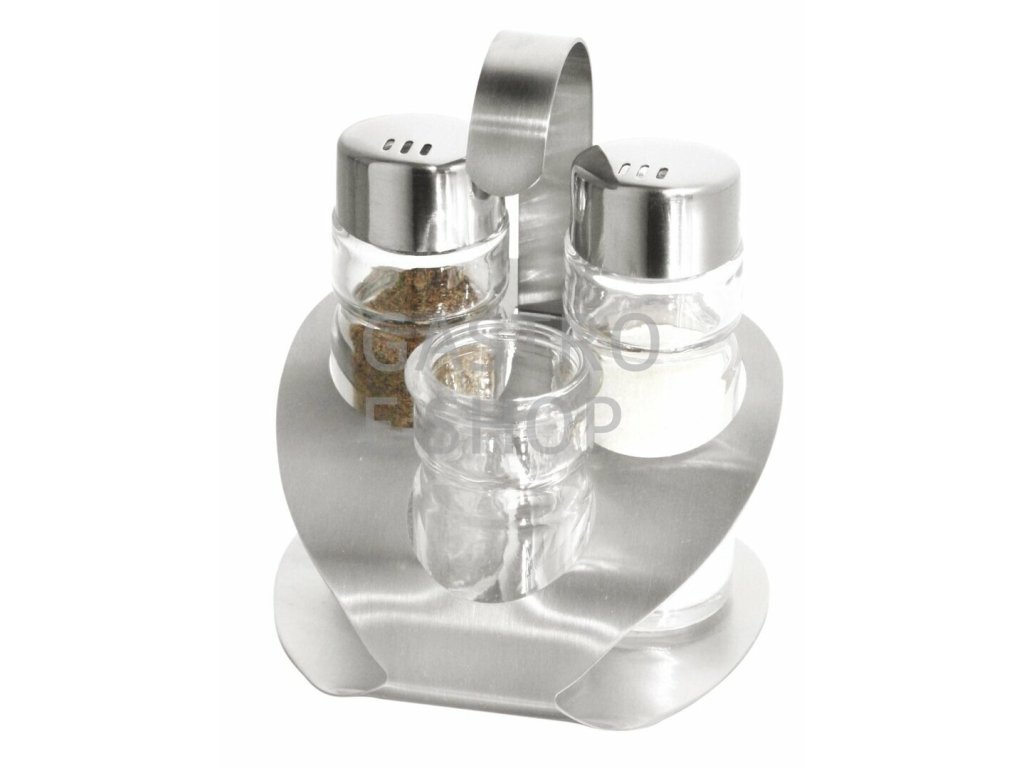 Elegantní nerezové stolní provedení menážky se slánkou, pepřenkou a skleničkou na párátka.