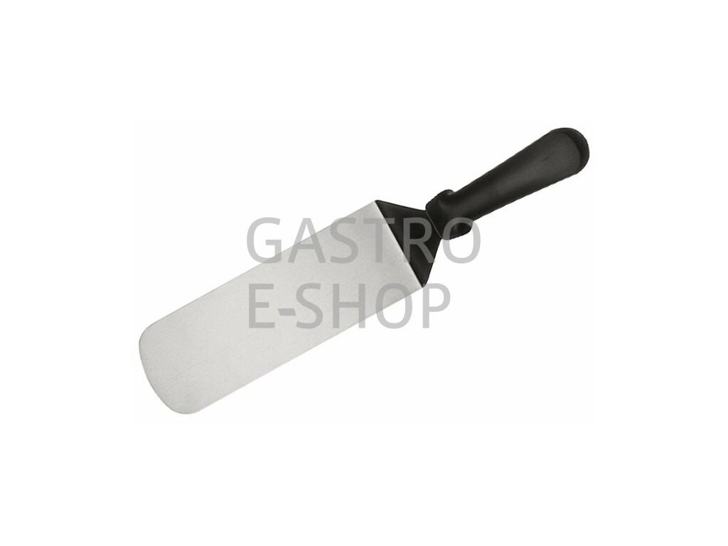 Dlouhá nerezová obracečka s ergonomickou plastovou rukojetí s rozměry 250x70mm a celkovou délkou 375mm.