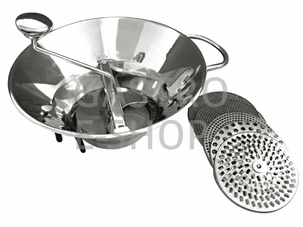 Profesionální celonerezová pasírka jejiž součástí je 5 disků s rozdílnými otvory.