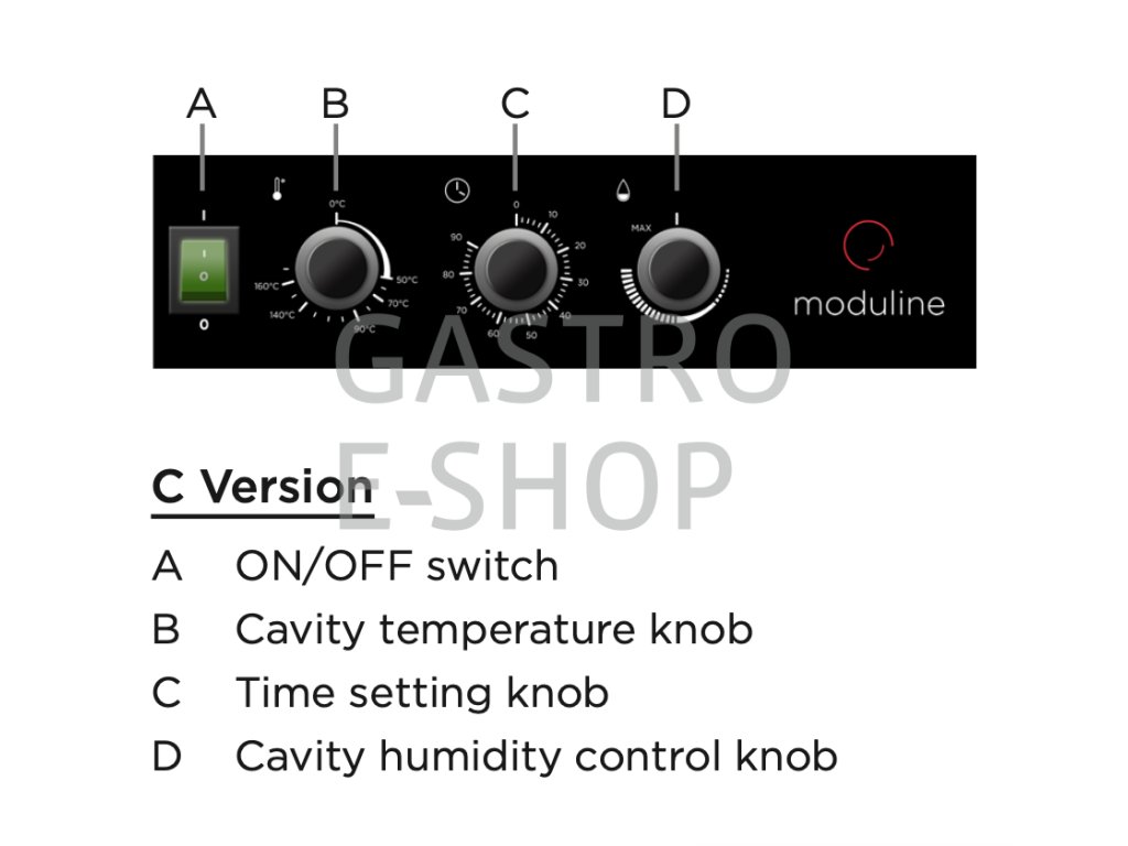 - Kontrolní panel teploty, času a vlhkosti. Elektromechanický (C), elektronický s digitálním displejem (D) nebo elektronický s dotykovým LCD displejem (E).