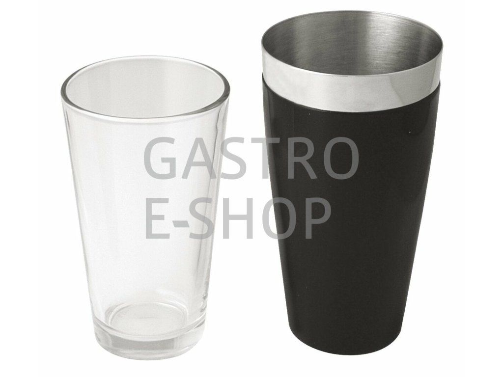Nerezový shaker Boston s vinylovým protiskluzovým povrchem 750ml a sklo k němu s objemem 500ml.