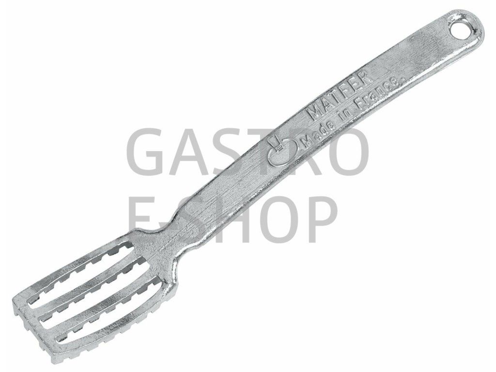Škrabka na ryby od firmy MAFTER BOURGEAT o délce 220 mm. Nástroj s okem na pověšení je odlitý z jednoho kusu hliníku a hodí se pro rychlé odstraňování šupin.