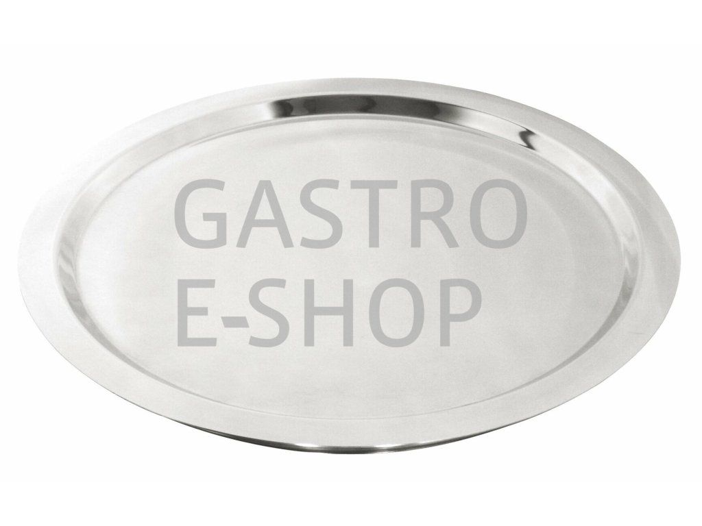 Kulatý nerezový tác s vyvýšeným okrajem 250 mm. Průměr podle varianty 420 nebo 480 mm.