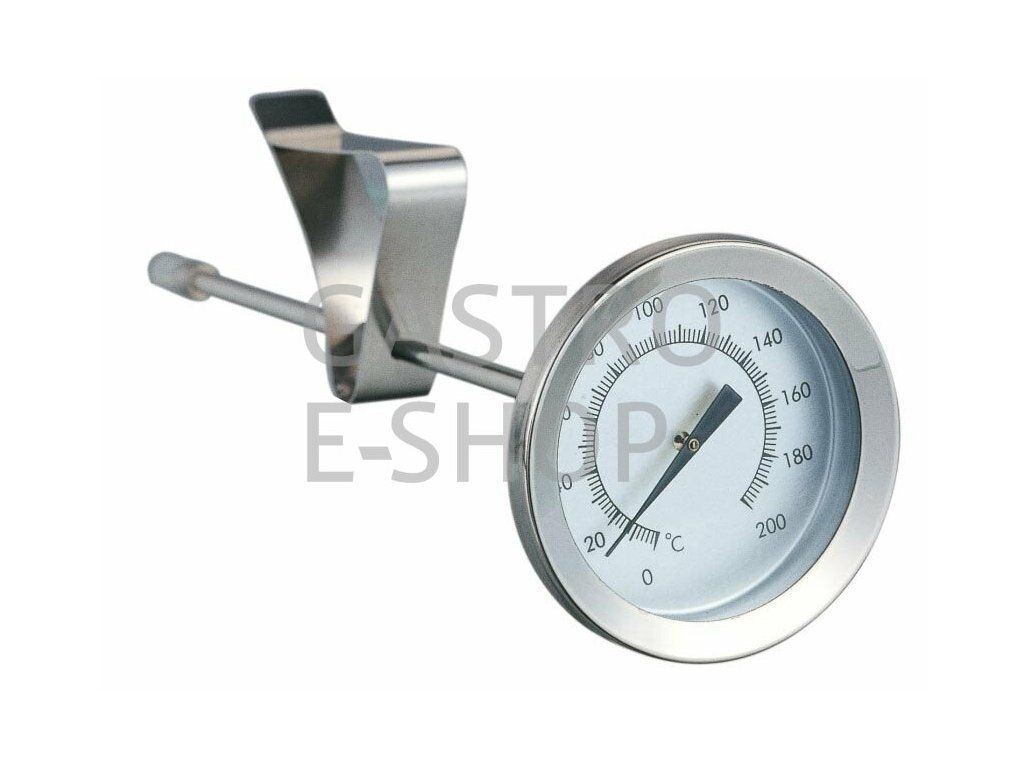 Nerezový bimetalový vpichový teploměr pro kontrolu teploty v jádře výrobku s rozsahem 0 až +200 °C. Součástí teploměru je spona pro uchycení na hrnec nebo gastronádobu.
