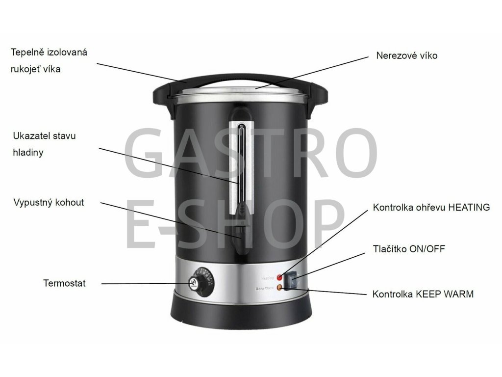 Automatické varné a udržovací termosy na přípravu a udržení horké vody a teplých nápojů. Luxusní celonerezové, dvouplášové, izolované provedení (minimální teplotní ztráty = ekonomický provoz), tělesa jsou skryta pod nerezovým dnem (snadné čistění a údržba). Automatický systém výroby horké vody, nebo udržení připravených nápojů na požadované teplotě. Výdej nápoje automatickým výpustným kohoutem a množství nápoje v termosu je přehledně indikováno na rysce hladinoměru. Snadné nastavení varné, udržovací, nebo výdejní teploty mechanickým termostatem (rozsah termostatu 30-100°C), vybaven centrálním vypínačem, kontrolkou chodu a nahřátí. Nerezové bezpečnostní víko s ergonomickým bezpečným plastovým madlem.