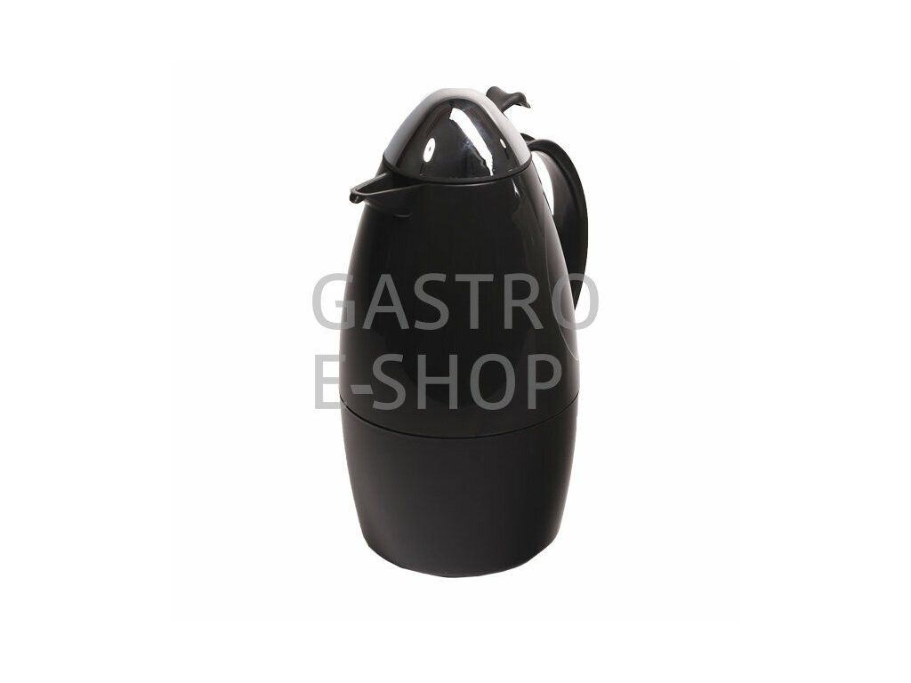 Černá plastová termoska s lesklým víčkem o objemu 1 litr.