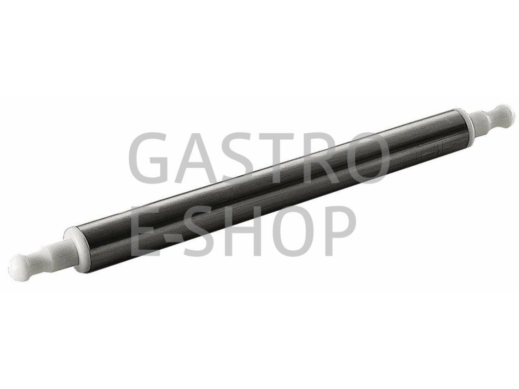 Široký váleček na těsto vhodný pro válení pizzy. Váleček má plastové rukojeti a střed z nerez-oceli.
