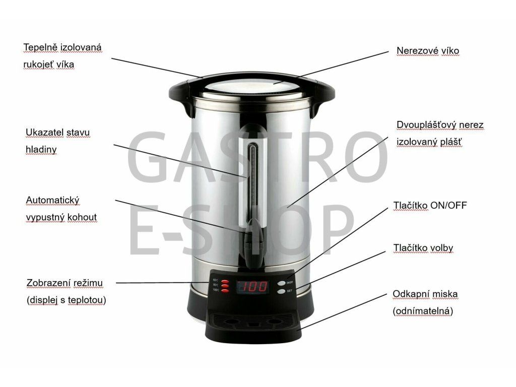 Automatické varné a udržovací termosy na přípravu a udržení horké vody a teplých nápojù. Luxusní celonerezové, dvouplášové, izolované provedení (minimální teplotní ztráty = ekonomický provoz). Automatický systém výroby horké vody, nebo udržení připravených nápojù na požadované teplotě. Výdej nápoje automatickým výpustným kohoutem a množství nápoje v termosu je přehledně indikováno na rysce hladinoměru. Snadné nastavení předvolené varné, udržovací, nebo výdejní teploty na digitálním ovladači (60 / 80 / 100°C), zobrazení aktuální teplotu vody a požadované předvolené teploty na podsvíceném displeji. Nerezové bezpečnostní víko s ergonomickým bezpečným plastovým madlem, odnímatelná odkapávací miska s vyjímatelným roštem pod výdejním kohoutkem.