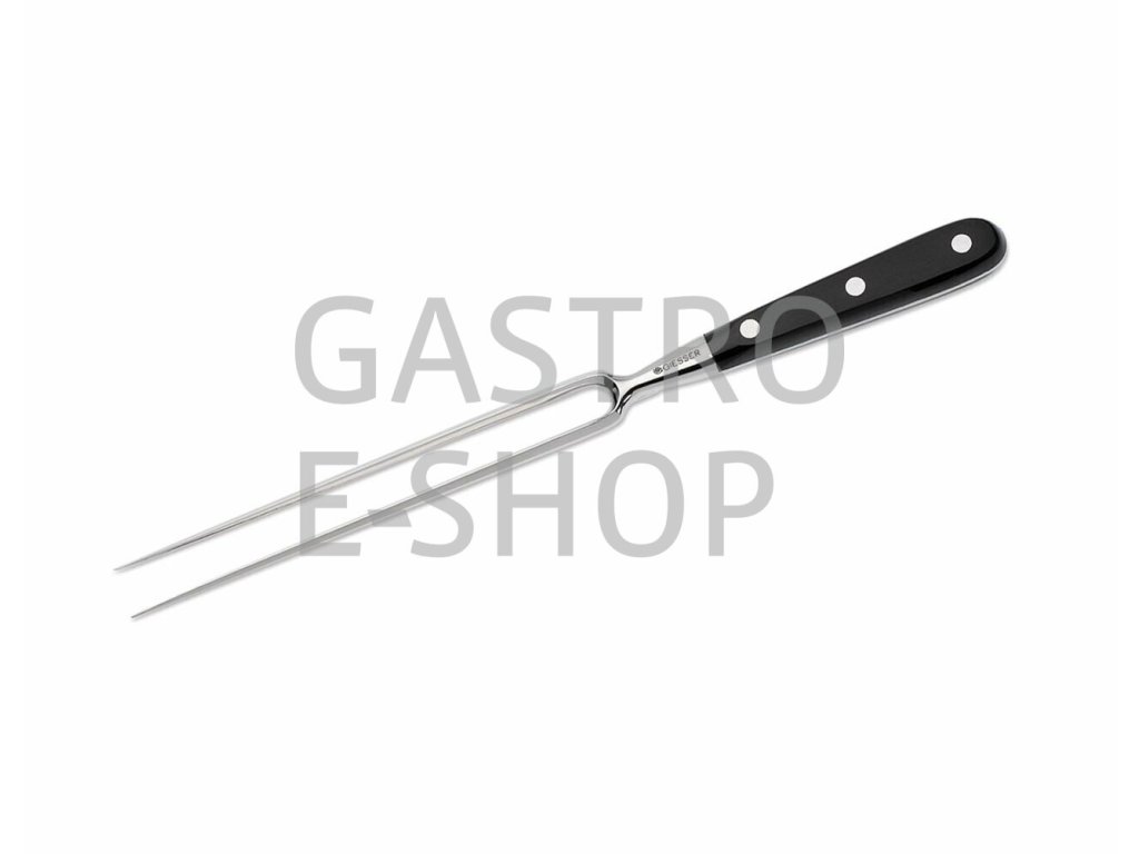 Vidlice na maso GIESSER kovaná z nerezové oceli. Velmi stabilní nástroj se zakřivenými hroty umožňuje kvalitní servírování masa. Nýtovaná plastová rukojeť zajišťuje pohodlný úchop.