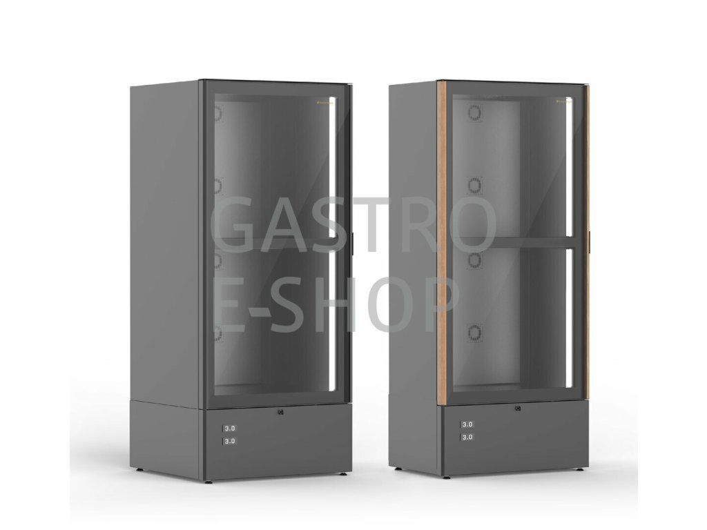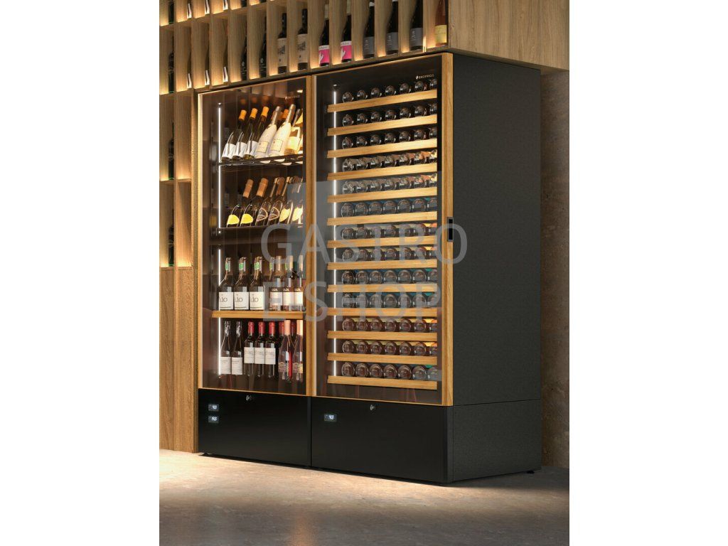 Plnoformátová vinotéka s profesionální výbavou, určená pro bary, vinotéky, restaurace a prémiové maloobchody, kde je kladen důraz na maximální kapacitu, estetický dojem a provozní účinnost. Dřevěná police dodává vitríně hřejivost, eleganci a podtrhuje její sofistikovaný vzhled. V ceně jsou 3 police na stojící láhve (každá po 65 ks). V případě zájmu je možnost zakoupení i jiných polic. Plášť je vyroben z recyklovaných materiálů, které lze po skončení životnosti opět ekologicky zpracovat.