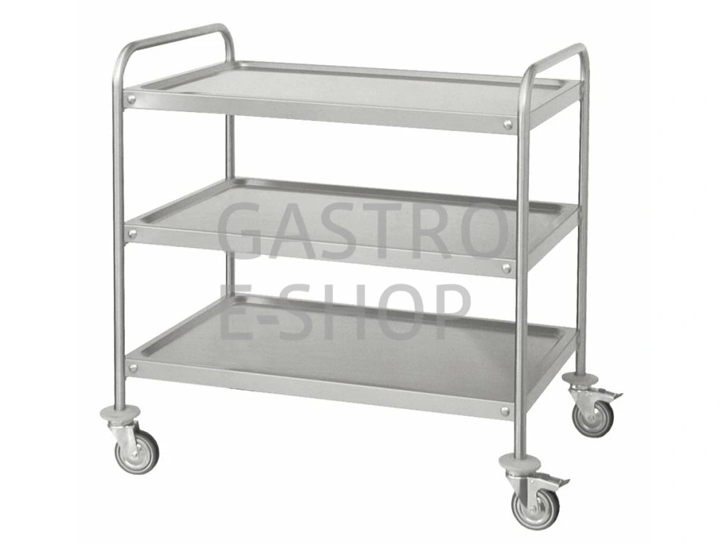 Masivní servírovací vozíky v nerezovém provedení se čtyřmi odolnými otočnými kolečky (2x bržděná). Police mají prolisované zvednuté okraje, pro lepší zabezpečení nádobí při přepravě. Vozíky jsou dodávány v rozebraném stavu, balené v kartonu včetně montážního materiálu. Vozíky jsou v robustním provedení s vyztuženými a zpevněnými rohy (vozík již není třeba zpevňovat svárem).