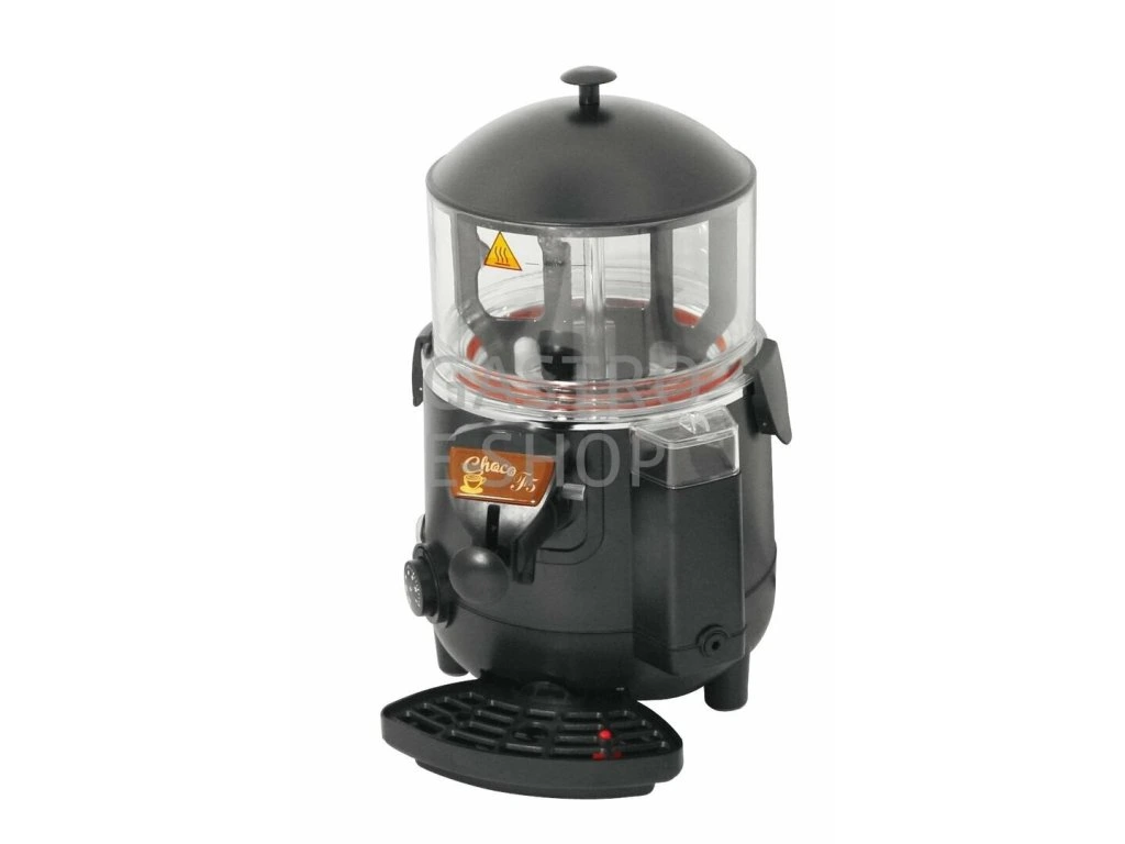 Výrobník horké čokolády CHOCO F-5 je koncipován na výrobu a prezentaci horké čokolády, ale i řady dalších horkých nápojů (káva, čaj, grog, punč, svařené víno atd.). Šetrný nepřímý systém ohřevu a udržení v teplém stavu (ohřev přes vodní lázeň-bain marie) s možností regulace teploty dle potřeby od +30 až do +100°C. Kontinuální rovnoměrné míchání (odolné míchací lopatky-vyjímatelné, hřídel vybavena silentblokem proti zanášení a namáhání) zamezuje tvorbě usazenin, sraženin a udržuje čokoládu v optimální konzistenci. Speciální konstrukce výpustného kohoutu zamezující ucpávání a umožňuje snadné čistění (kohout vybaven pákou snadného mechanického pročistění). Ohřev vody je prováděn v nerezovém duplikátoru (AISI 304), který je vybaven tepelnou ochranou. Snadno odnímatelná nádoba je vyrobena z odolného čirého polykarbonátu. Odkapová miska je vybavena plovákem indikujícím plný stav.