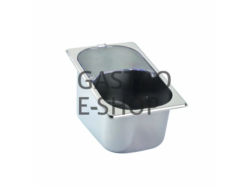 Nádoba na příbory z nerezové oceli, GN 1/4-150 s úhlovou základnou a sklopným víkem z plexiskla s poloviční klapkou pro použití ve vozících a volně stojící.